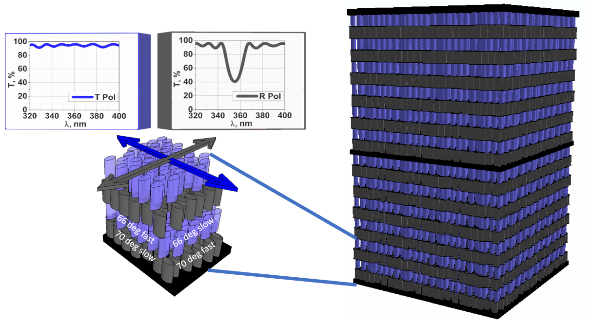 Dr. Tomas Tolenis: „Nulinis” šviesos poliarizatorius yra skulptūrinės dangos pagrindu suformuotas optinis elementas, pro kurį praėjusios šviesos poliarizacijos - išsiskiria (Pav. 1). Taip nutinka, nes elementas, dėl savitos nanostruktūros, pasižymi skirtingomis optinėmis savybėmis šviečiant į jį skirtingomis kryptimis poliarizuota šviesa. Kadangi danga yra efektyvi nulio laipsnių kampu, ją galima dengti ant netiesinio aktyvaus komponento, kuris generuoja šviesą, vadinasi, nebereikia į lazerį dėti kito atskiro komponento, taip yra sutaupoma vietos lazerinėje sistemoje. Nanotechnologijų amžiuje, kai visose srityse įrenginiai bei jų dalys „traukiasi”, tai labai svarbu. Taip pat atsiranda ir papildomos teigiamos savybės: tokia mikrolazerine sistema galime sugeneruoti trumpesnius impulsus, inovatyvūs komponentai atlaikytų didesnes galias, todėl tampa įmanoma su mikro ir nano lazeriais išgauti didesnes galias. Tokios sistemos naudojamos taršos matavimams, lazeriniuose jutikliuose, automobilių industrijoje ir kt.